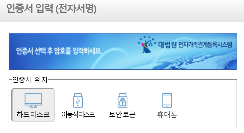 기본증명서 인터넷 발급에서 이제는 가장 중요하고 번거로운 공인인증서 로그인 장면입니다. 자신이 하드 디스크인지 usb인지 핸드폰에 저장되었는지는 각자가 다르기 때문에 맞는 것을 선택하시고 로그인을 해주시면 돼요.