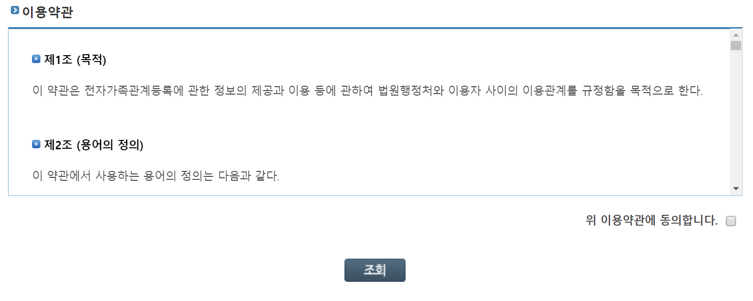 위 이용약관에 동의합니다. 조회를 누르시면 됩니다.