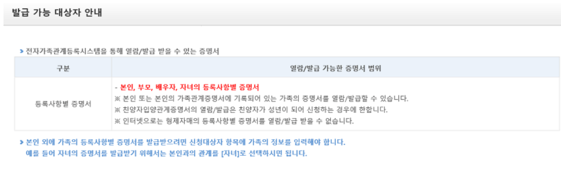 일단 기본적으로 본인, 부모, 배우자, 자녀의 등록사항별 증명서가 되고 이런 관계에서 발급이 가능하고 또한 친양자가 성년이 돼서 신청하는 경우에 가능합니다.