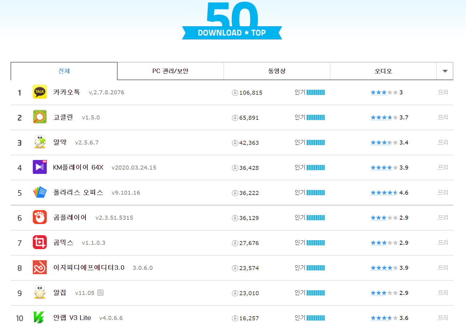 그리고 일단 다운로드 탑을 보시면 역시나 카카오톡 다운로드 부분이고 그리고 고클린이 되겠습니다. 그리고 km플레이어나 아니면 플라리스 오피스 부분을 보시면 됩니다. 매우 좋은 프로그램중 하나죠.