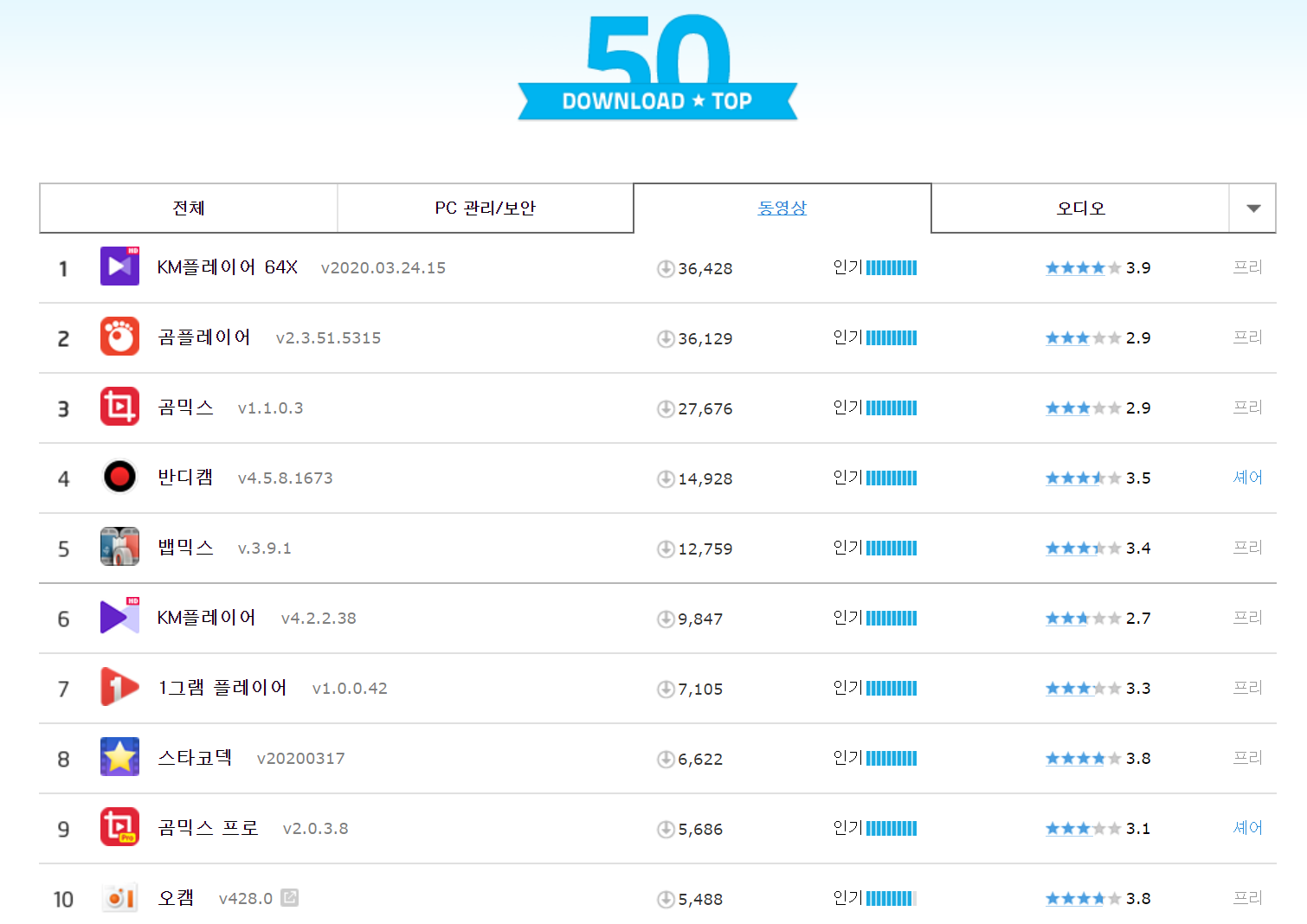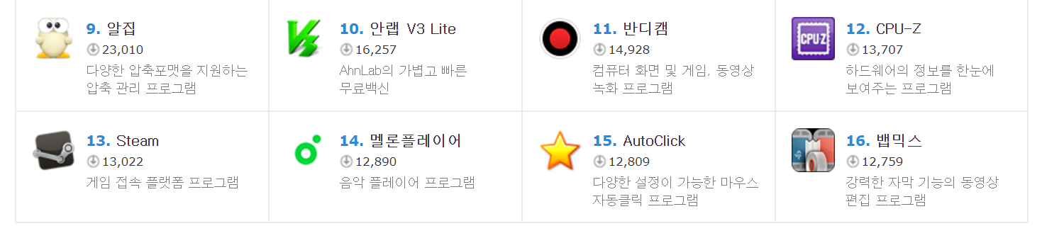 그리고 9위부터 쭉 보시면 기본적으로 18위까지는 일단 뱁믹스 부분입니다. 동영상 편집프로그램인데 기본적으로 많이 쓰는 부분이기도 하구요.