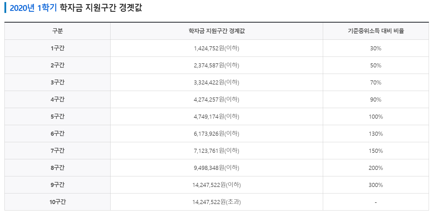국가장학금 지원구간 경곗값이라고 하여 소득분위 기준이 됩니다.