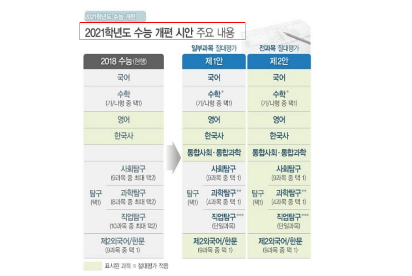 2018년도 마지막 수능 개편이 있었고 이번 2021년 특별히 코로나 세대 아이들의 수능 개편안 입니다. 참고 해서 보시겠습니다. 기본적으로 정말 많은 사람들이 이런 시간제로 나뉘어서 보게 되는데요. 과목마다 분별되는 부분입니다.