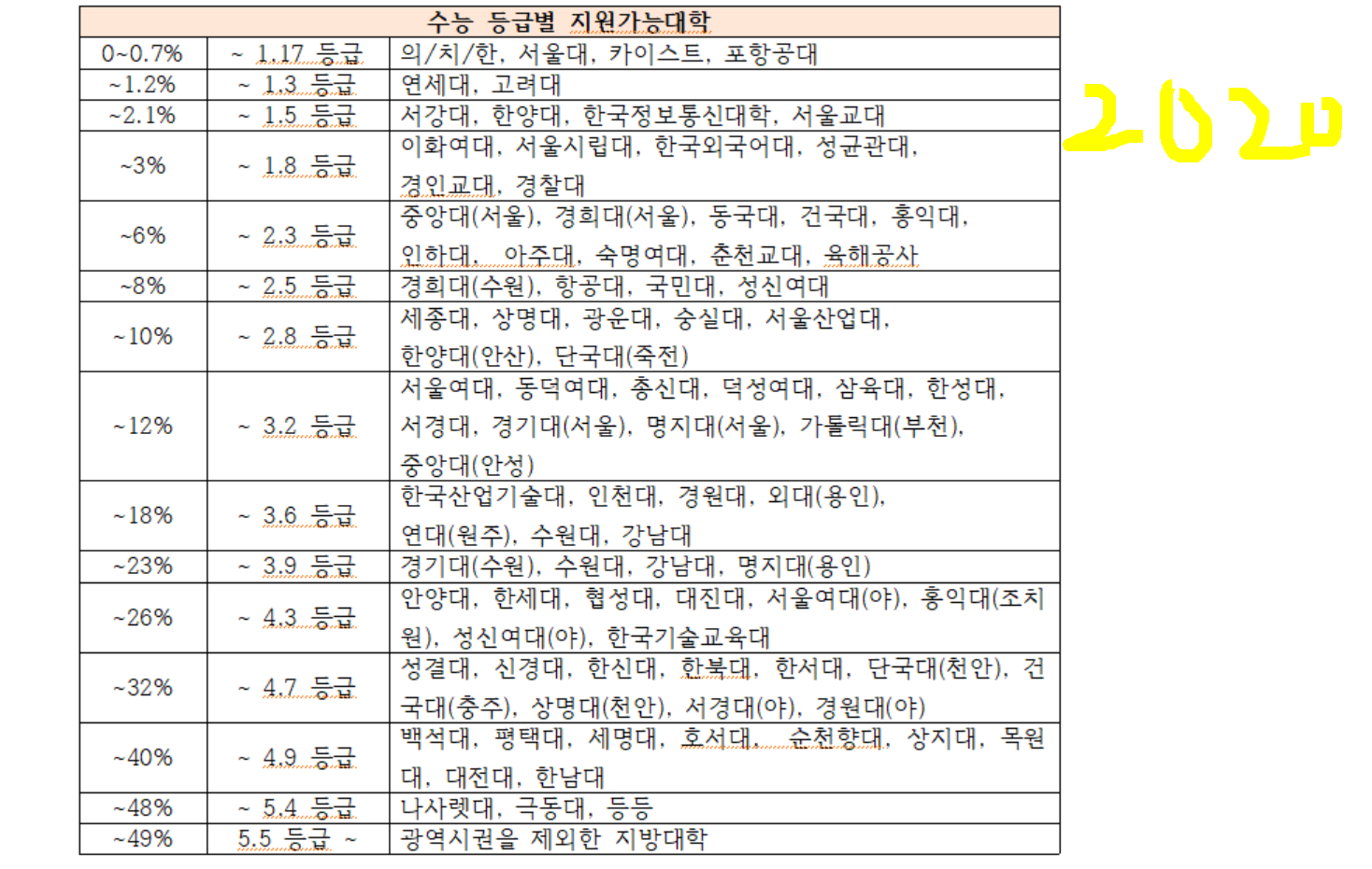일단 이 지표는 작년 2020년 수능 등급별 지원가능대학 표입니다. 이부분을 어떻게 이해하면 되냐면 작년 기준 이 기준으로 이런 대학을 들어갔다고 보시면 되는데요. 추가적으로 올해 결과가 나오면 내년 수능 보신분들이 참고 하게 되는 것입니다.