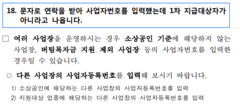 일단 1,2차 지급대상이면 문자가 와야되는 것으 많습니다. 그러나 못받는 경우가 있을수 있습니다. 그리고 자신의 여러사업장을 운영하는 경우 안올수가 있기 때문에 다른 사업장 번호를 직접 입력해보시고. 대표적으로 미성년자나 계좌 압류자 등은 가족증빙서류를 통해서 다른 계좌 확인이 가능합니다.