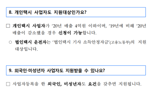 네네 가능합니다. 일단 산재대상의 14개직종의 경우 그리고 사업종등록증 보유한경우 가능하고 이밖에 고용안정지원금으로 특별신청이 가능힙니다. 특히나 개인택시 는 어떻게 될가요. 20년도에 19년도에 비교해서 수익이 줄었다면 가능합니다. 법인택시 같은 경우는 따로 소득안정지원금으로 나가게 됩니다.