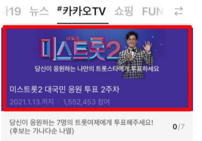 미스트롯2 대국민 응원투표 or 인기투표에 참여하세요 라는 배너가 보입니다. 이곳을 살펴보께요.