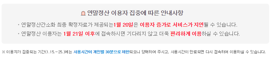 기본적으로 연말정산 간소하 하는 이용시간 자체가 30분으로 제한이 되었기 때문에 접속하기 전에 미리 이글을 보면서 예행 연습을 해야합니다.