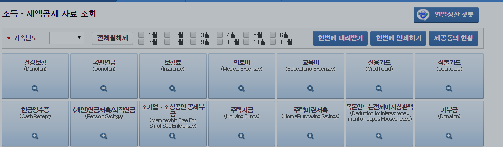 이 2가지를 인증 중에서 하나만 선택한 이후에 넘어가시면 소득, 세액공제 자료 조회를 해볼수가 있습니다. 일단 자신이 직장을 다녔던 부분에 월을 체크 하고 그리고 돋보기 버튼을 보시고 자신이 제출하고 자하는 소득공제 세액공제를 택하시고 금액이 나오면 한번에 내려받기 하시면 되고 그 파일을 회사에 제춝하시면 됩니다.