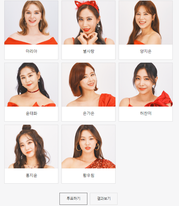 단 여기서 7명을 선택해야지만 투표하기 버튼이 보라색으로 활성화 된다는 것은 비밀!! 그리고 옆에 결과보기 창은 왜 있는지 알수가 없습니다. 항상 다음 방송회에서 지켜보시기 바랍니다 라고 나오기 때문인데요.