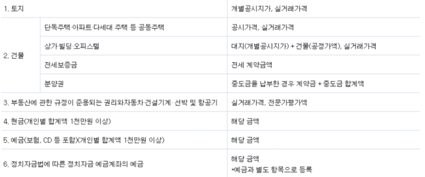 자신의 자산을 거의 모두 등록을 해야하면 되는데요. 대표적으로, 현금 이나 부동산, 그리고 각종 예금 등 모두들 확인하고 알면 되겠습니다. 그리고 회원권이나 각종 토지다 포함입니다. 거기에 따라서 이미를 통해서 알아보도록 하겠습니다.