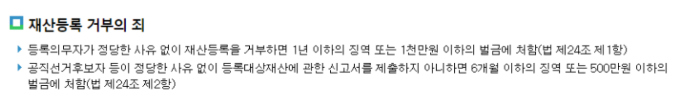 일단 재산등록 해당이 되는데 거부한 경우에는 일단 재산등록 거부죄에 등록이 되는데요. 이는 일단 정당한 사유가 없이 거절하는 경우는 1년 이하 그리고 1천만원 이하의 벌급에 처하게 됩니다. 참고 하고 알아보아야합니다.