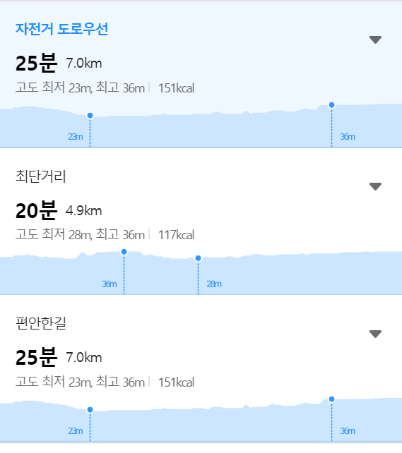 편안한 길은 일단 오르막이나 내리막이 없는 자전거 도록 우선의 길을 먼저 보여주는 것을 뜻하게 됩니다. 다음 지도는 이런 세심한 배려까지 다 있는 것이 너무 좋은 거 같습니다.