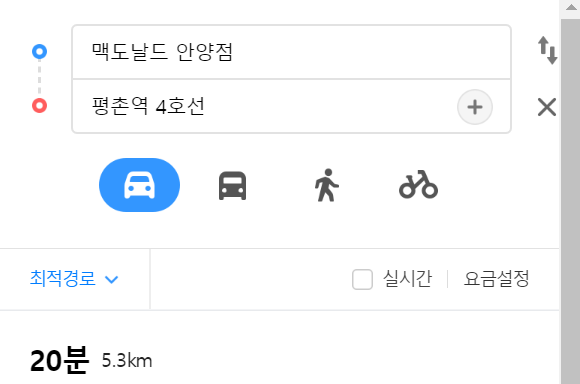 다음 지도 보시면 일단 검색창이 가장 눈에 먼저 띄게 되죠. 저는 일단 자주 가는 곳이 평촌이고 그리고 맥도널드에서 이동하는 것을 기준점으로 한번 해보도록 하겠습니다. 제주도나 광화문 이야기는 많으니깐요