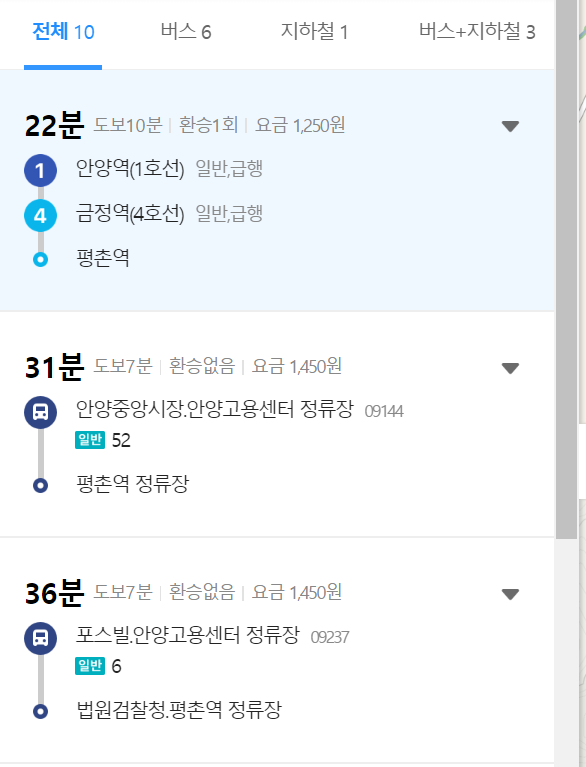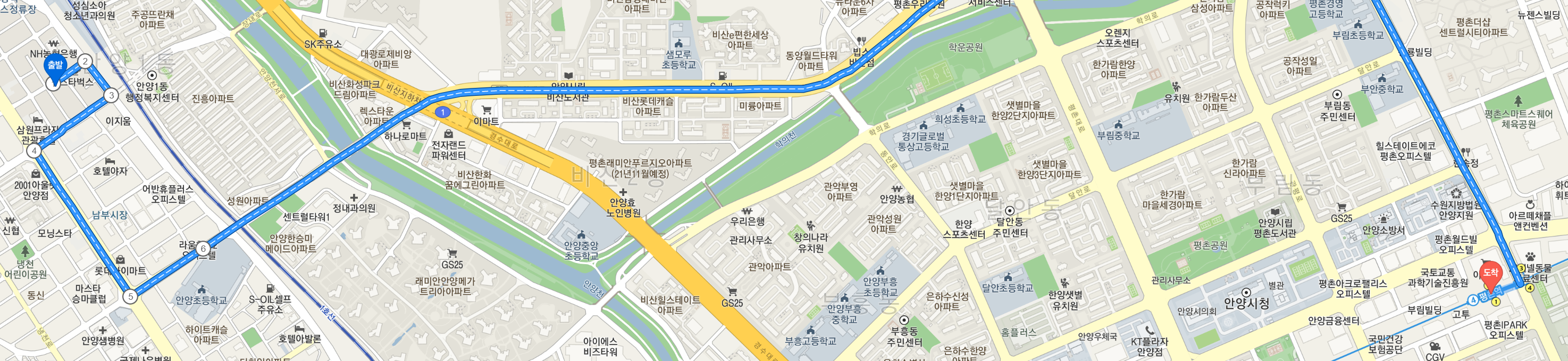 대충 교통을 이용한 이동인데요. 실제로 거리상은 훨씬 더 돌아가는 거처럼 보이지만요 음 뭐랄까 걸리는 시간은 거의 똑같네요? 2분 차이? 지하철로 이동하는 교통 노선이네요. 안양역에서 평촌으로 환승 한 번을 거치는 이동거리라고 보시면 되겠습니다.