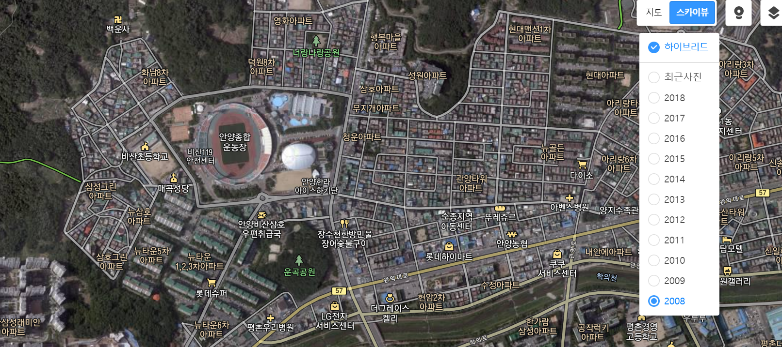 다음 지도 스카이뷰 눌러보면 각 연도별 사진을 보시면서 이 지역이 어떻게 발전되어 왔는지를 보실 수가 있어요 정말 짱짱 멋진 기능이라고 하실 수가 있네요. 와 그래서 2008년도 사진을 보았는데요. 최근의 사진과 비교해보면 정말 시골스럽다는 느낌을 받을 수가 있었어요.