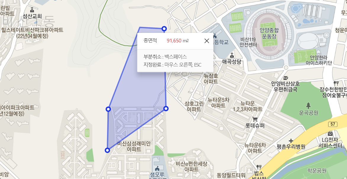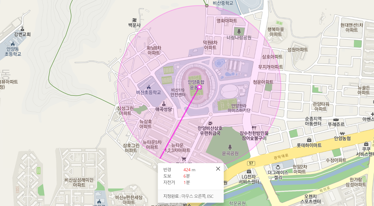 다음 지도 바로가기해서 또 볼 수 있는 다양한 기능들은 바로 거리 체크하는 기능입니다. 안양 종합운동장에서 비산 래미안까지의 거리를 제어 보았는데요. 약 360미터 거리입니다. 하지만 길로 따라서 다시 체크하게 되면 조금은 늘어나겠죠. 하지만 래미안 뒤의 산과 뒷길이 있기 때문에 정말 빨리 이동이 가능하리라 생각이 드네요.